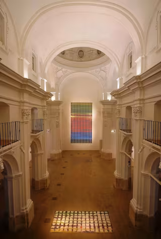 Munuera creó las obras específicamente para este espacio, la iglesia desacralizada de un antiguo convento del siglo XVIII, en el que se exhiben cinco pinturas y tres vídeos del autor. Entre sus composiciones destaca la espectacular obra 'Frame Time Color Chart VS', en la que un total de 448 piezas, a modo de pequeñas 'foto-pinturas', construyen un mural de más de siete metros de alto por cuatro de ancho.
