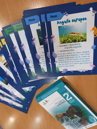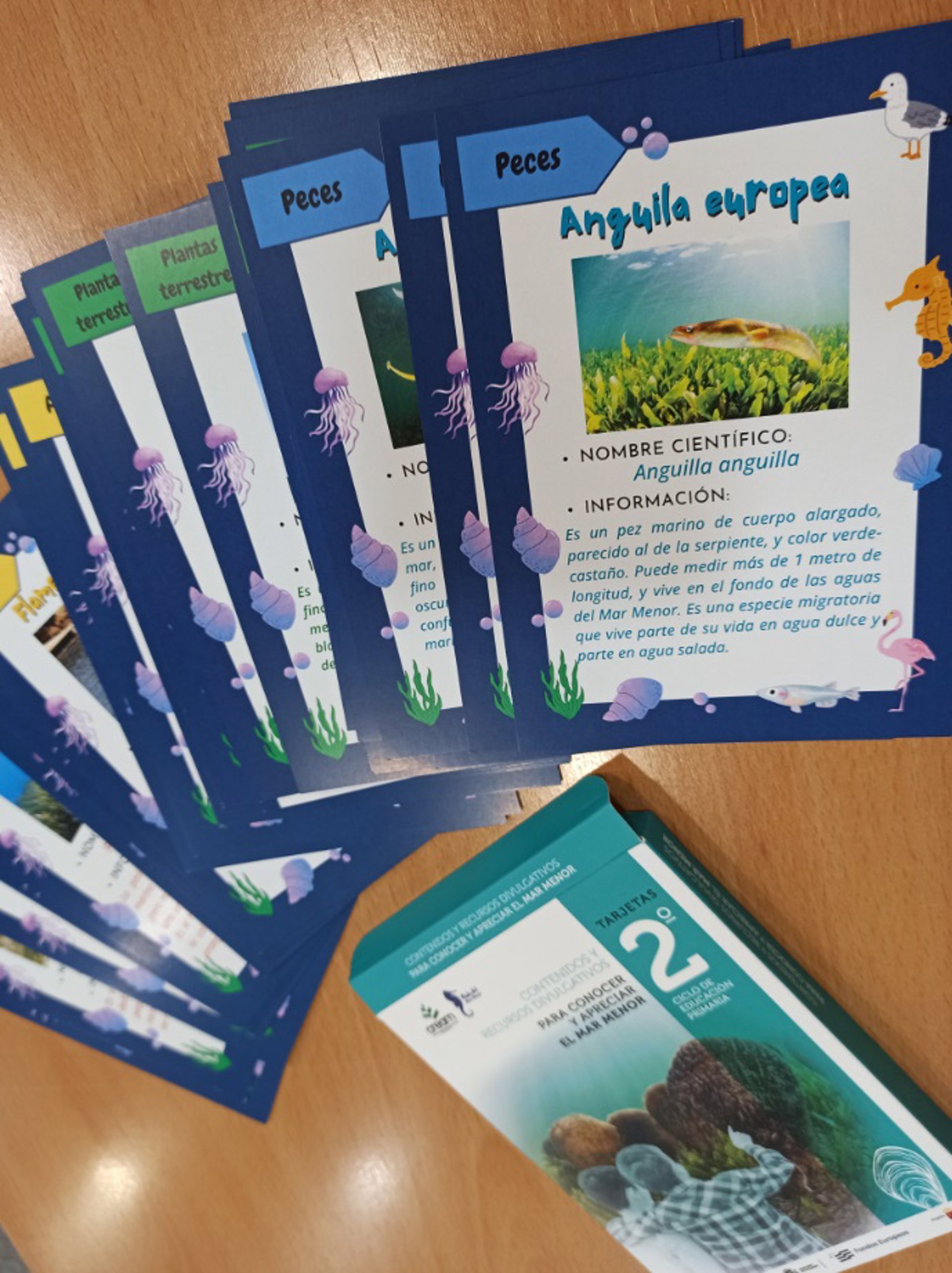El Aula del Mar Menor se ha apoyado en una amplia variedad de recursos divulgativos diseñados para facilitar la comprensión de la biodiversidad y la riqueza cultural del ecosistema. Entre ellos destacan cuadernos del monitor en tres niveles, dirigidos tanto a divulgadores ambientales como a docentes de Primaria y ESO; un mapa ilustrado del Mar Menor, obra del artista Alberto Molina Serrano, que representa su patrimonio natural, cultural y las actividades económicas vinculadas al territorio; y dos juegos de tarjetas educativas con 38 especies representativas y singulares de cinco biotopos: salinas, columna de agua, fondos marinos, humedales adyacentes y dunas con playas.