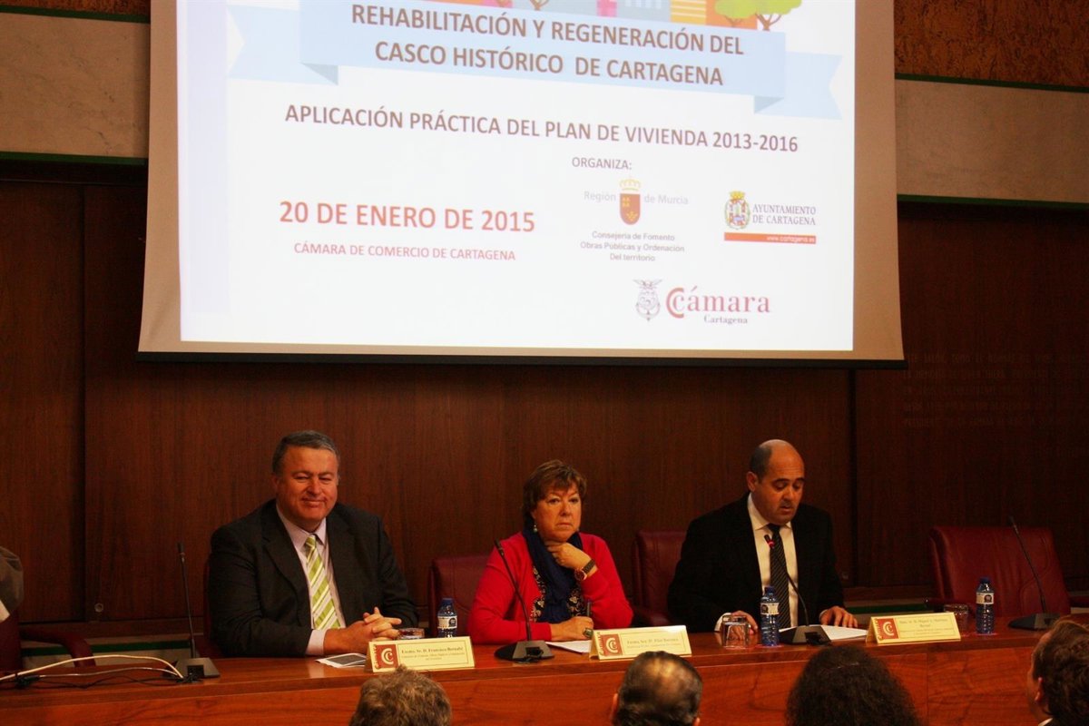 La jornada informativa 'Rehabilitación y regeneración del casco histórico de Cartagena' ha permitido acercar la aplicación práctica del Plan de Vivienda 2013-2016 en la ciudad al sector empresarial, colegios profesionales y colectivos relacionados con el ámbito de la edificación, y ciudadanos en general, mediante el desarrollo de un Área de Regeneración y Renovación Urbana en el Casco Histórico de Cartagena.