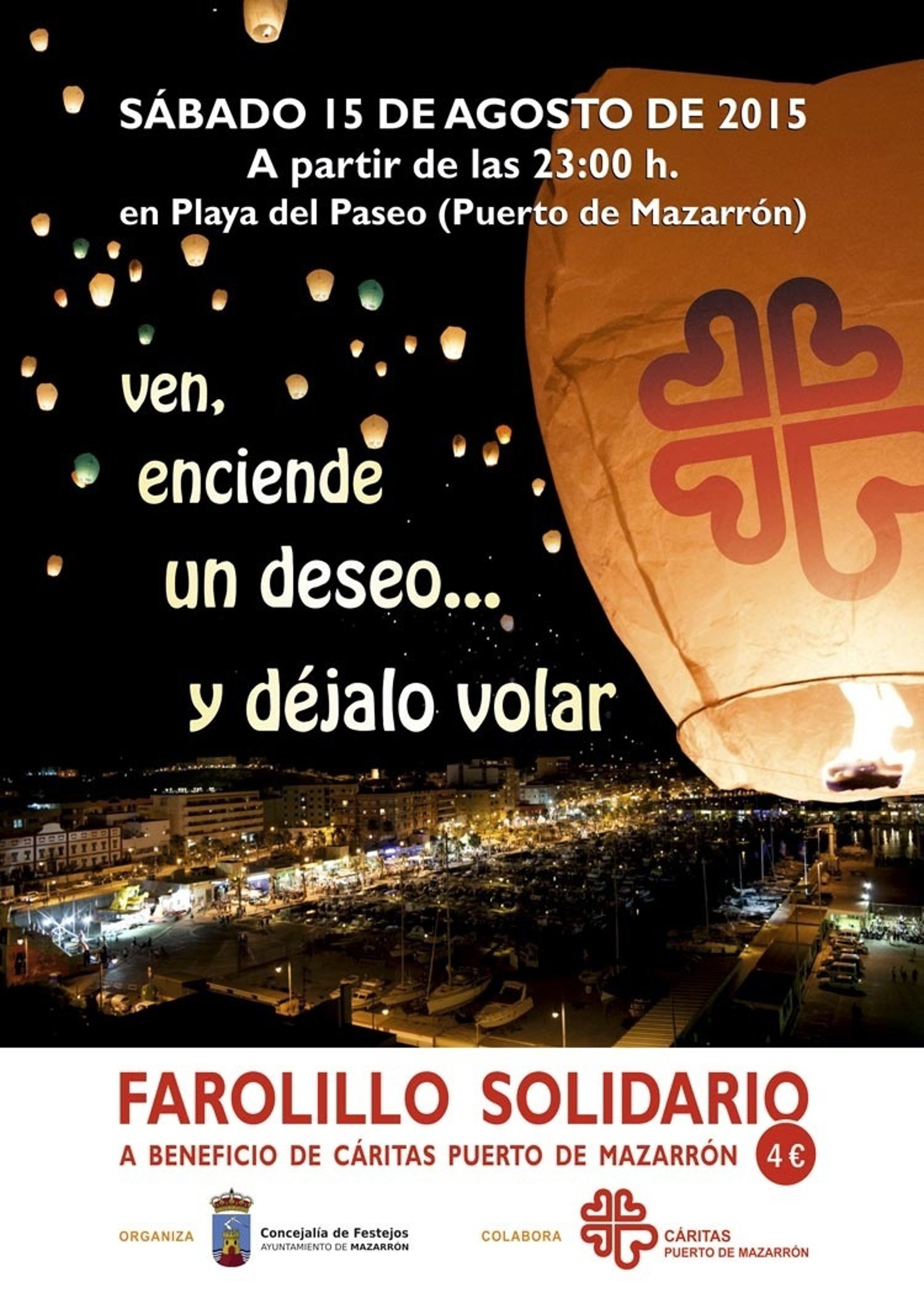 Por tercer año consecutivo la bahía de Mazarrón volverá a ser iluminada, esta vez por más de 1.000 farolillos en lo que es una iniciativa solidaria a beneficio de Cáritas que albergará la playa del Paseo de Puerto, a partir de las 23.00 horas de este sábado.