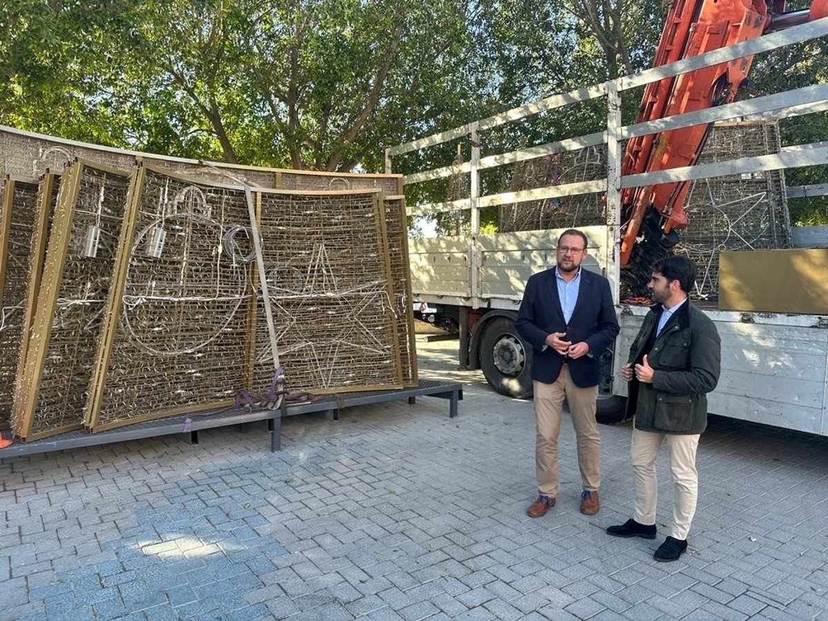 El teniente de alcalde de Desarrollo Urbano y Ciudad Inteligente, José Guillén, y el concejal de Cultura e Identidad, Diego Avilés, junto a parte del decorado navideño - AYUNTAMIENTO DE MURCIA