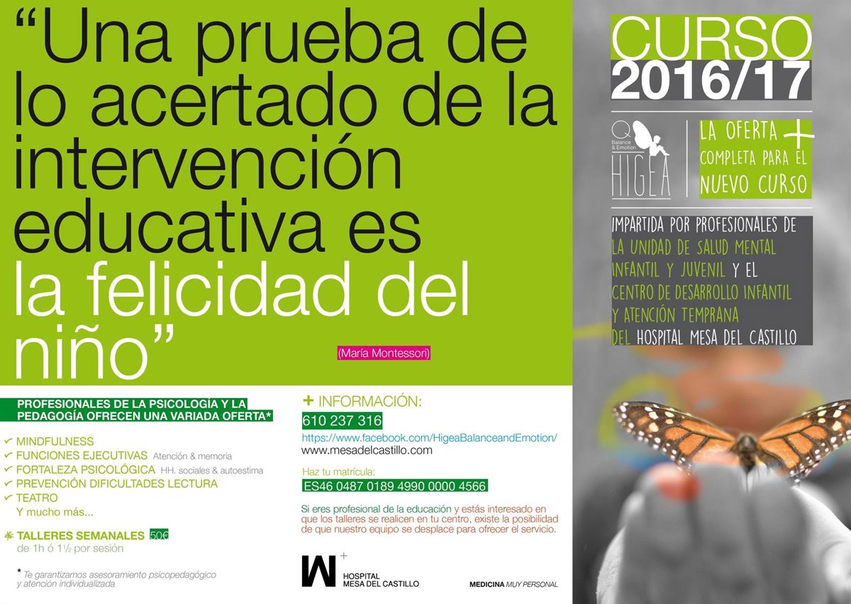Los profesionales del Centro de Desarrollo Infantil y Atención Temprana del Hospital Mesa del Castillo han creado Higea, un servicio de cursos dirigidos a niños de todas las edades y padres que busquen un desarrollo saludable de sus hijos y la adquisición de herramientas y conocimientos para su propósito.