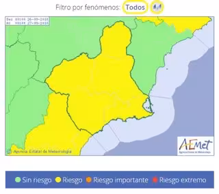 La Agencia Estatal de Meteorología (Aemet) ha activado para este miércoles, 26 de septiembre, el aviso amarillo, que significa riesgo por tormentas, en toda la Región de Murcia.