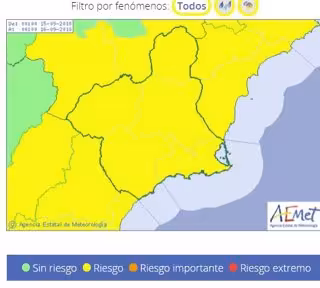 La Agencia Estatal de Meteorología ha activado el aviso amarillo, que significa riesgo, por lluvias y tormentas este sábado, 15 de septiembre, en toda la Región de Murcia, según se desprende de la página web de la Aemet, consultada por Europa Press, así como del Centro de Coordinación de Emergencias.