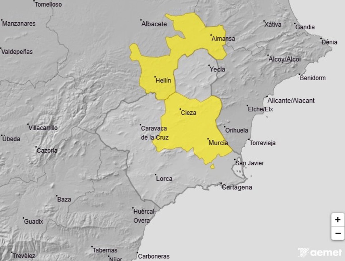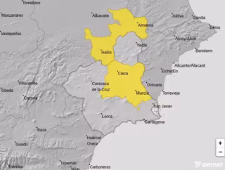 Y para el jueves, la Aemet anuncia fenómenos meteorológicos adversos de nivel amarillo por lluvia (15 litros por metro cuadrado en una hora) y tormentas en el Altiplano, Noroeste y Vega del Segura desde las 12.00 hasta las 00.00 horas.