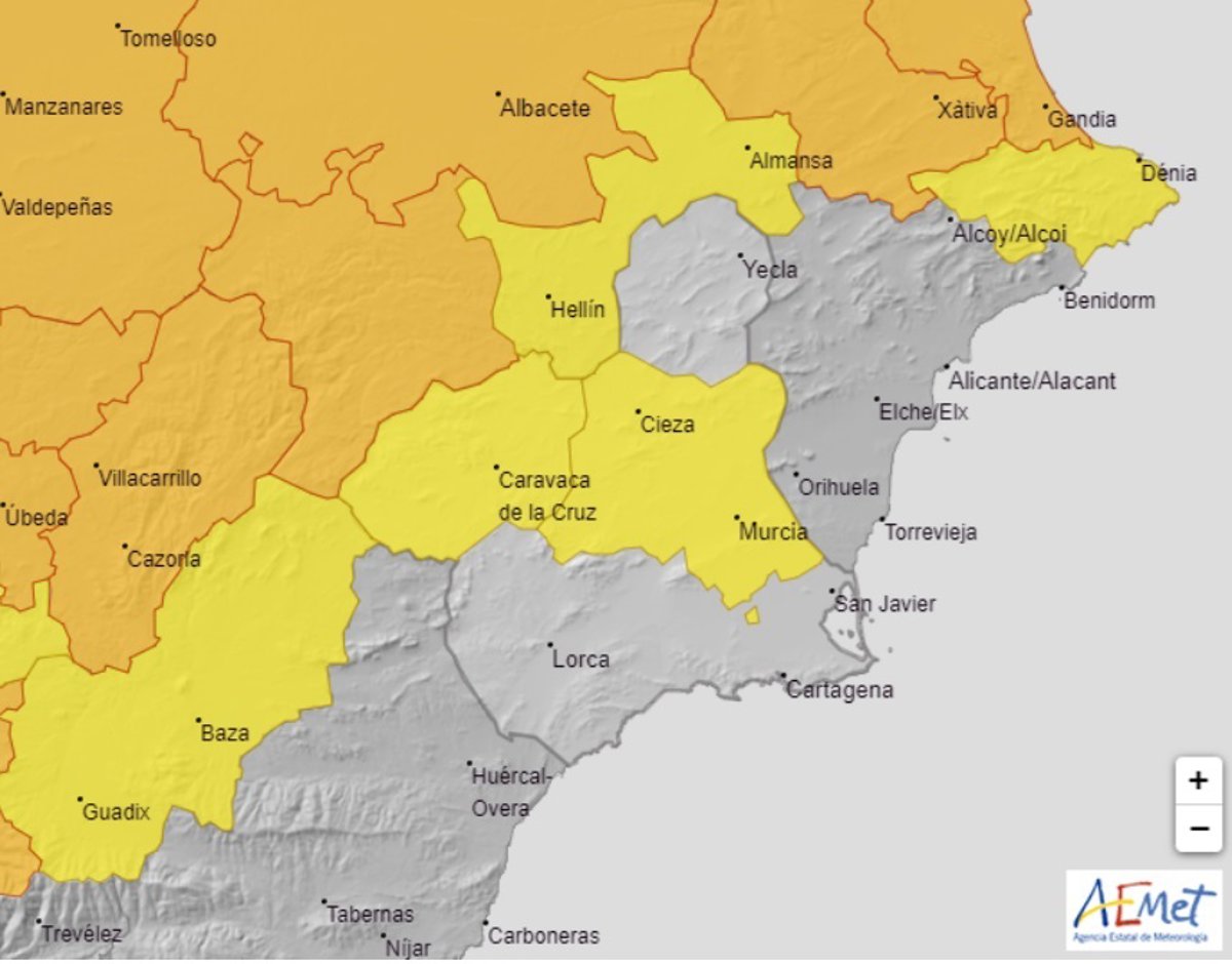 Este aviso estará activo en el Noroeste y Vega del Segura. El resto de la Región permanecerá sin riesgo, según fuentes del Centro de Coordinación de Emergencias consultadas por Europa Press.