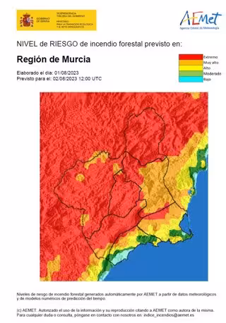 La Agencia Estatal de Meteorología (Aemet) ha establecido para este miércoles, 2 de agosto, riesgo de incendio forestal extremo o muy alto en casi toda la Región de Murcia.