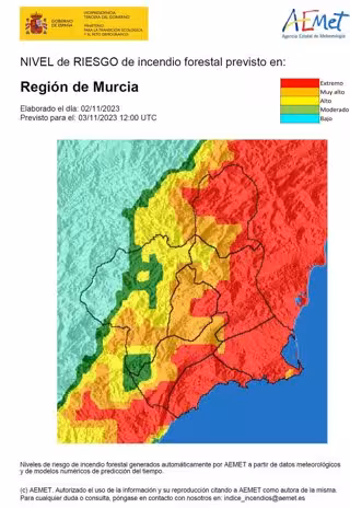Mapa que muestra el nivel de riesgo de incendio forestal en la Región de Murcia - AEMET