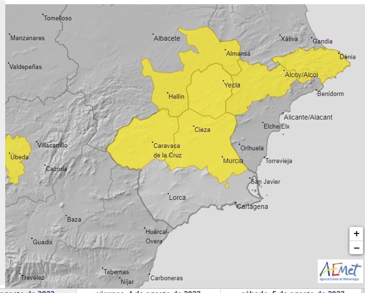 La Agencia Estatal de Meteorología (Aemet) mantiene este jueves el aviso de nivel amarillo por temperaturas que podría llegar a los 38 grados Centígrados en las comarcas del Altiplano, Noroeste y Vega del Segura.