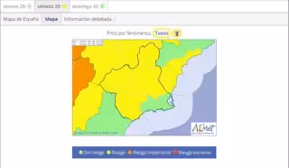 La Agencia Estatal de Meteorología mantiene su aviso de fenómenos meteorológicos adversos de nivel amarillo por temperaturas que pueden llegar a los 38 grados el sábado, día 29, en el Altiplano, Noroeste, Vega del Segura y Valle del Guadalentín, Lorca y Águilas.