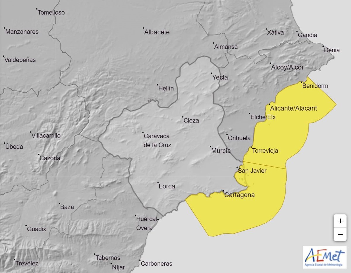 La Agencia Estatal de Meteorología (Aemet) mantiene activo el aviso de fenómeno adverso de nivel amarillo por fenómenos costeros en el litoral del Campo de Cartagena y Mazarrón.