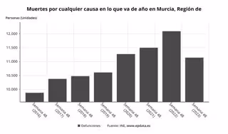 La Región de Murcia ha registrado hasta noviembre de 2023 un total de 11.141 defunciones, un 7,85% menos que en el mismo periodo de 2022, frente al descenso de la media nacional, que fue del 6,32% en el mismo periodo, según datos del Instituto Nacional de Estadística (INE) recogidos desde la semana 1 a la 48 del año en curso.