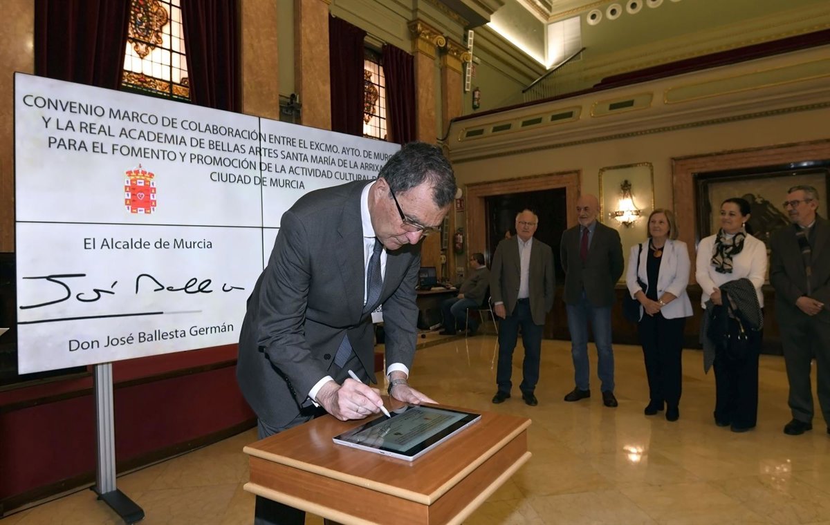 El Ayuntamiento de Murcia y la Real Academia de Bellas Artes Santa María de la Arrixaca estrechan lazos con la celebración de una gran exposición en homenaje a los pintores murcianos del siglo XX. El alcalde José Ballesta y el director de la entidad, Martín Páez, han firmado un convenio de colaboración para el fomento y promoción de la actividad cultural en Murcia y que supondrá la puesta en marcha de proyectos comunes.