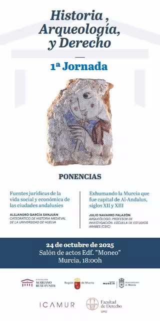 El acto incluirá una primera ponencia titulada 'Fuentes jurídicas de la vida social y económica de las ciudades andalusíes', a cargo del catedrático de Historia Medieval de la Universidad de Huelva Alejandro García; y una segunda, denominada 'Exhumando la Murcia que fue capital de Al-Andalus, siglos XII y XIII', del arqueólogo y profesor de la Escuela de Estudios Árabes del CSIC Julio Navarro.