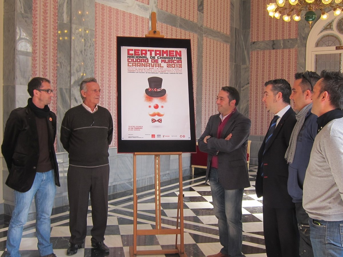El concejal de Cultura del Ayuntamiento de Murcia, Rafael Gómez, junto con el presidente de la Asociación Cultural Musical Chirigota de Beniaján, Javier Sánchez y el alcalde pedáneo de Beniaján, Paco Hernández, ha presentado este miércoles el primer Certamen Nacional de Chirigotas de la ciudad de Murcia, que se realizaba tradicionalmente en Beniaján y que este sábado tendrá lugar en el Teatro Romea.