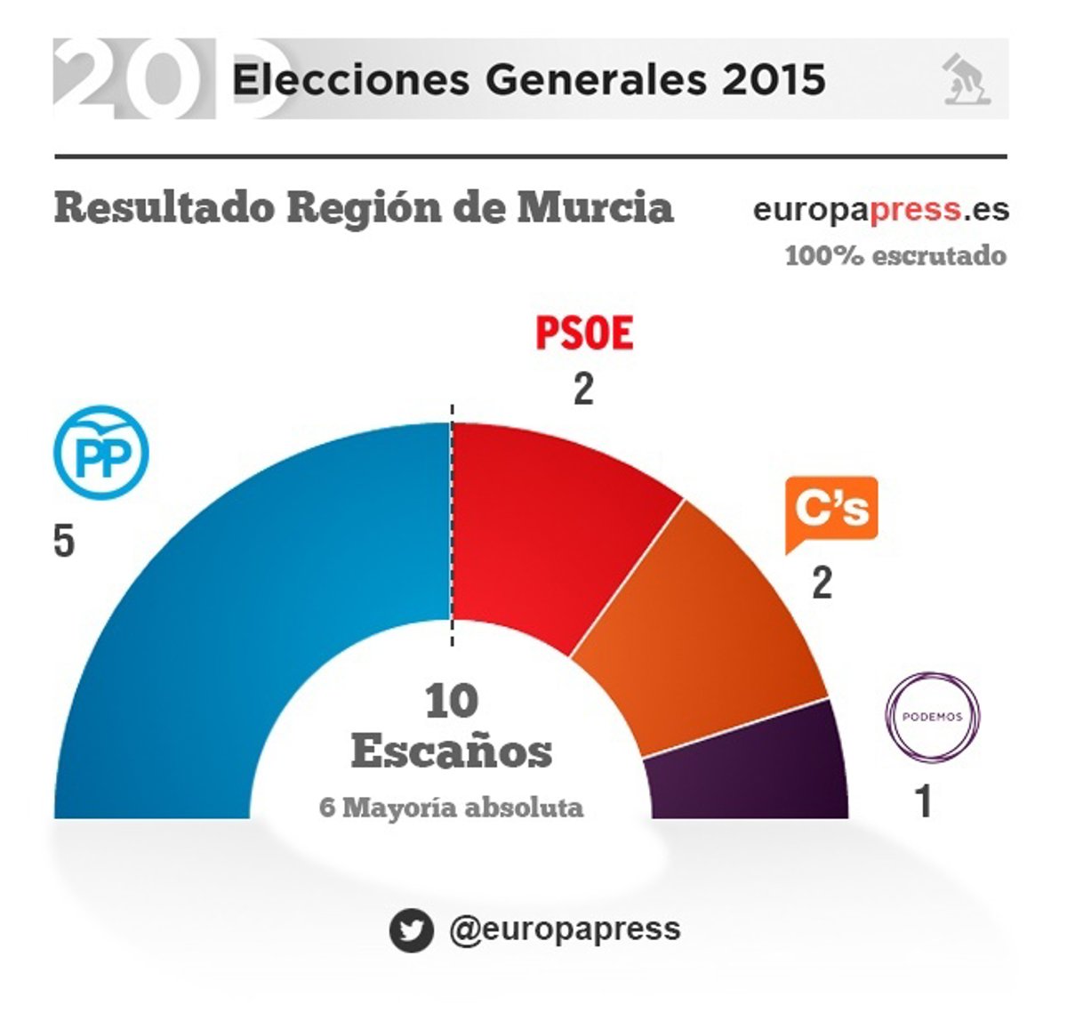 El PP vuelve a ganar las elecciones en la Región de Murcia al conseguir cinco de los diez diputados que le corresponden a la Comunidad, pero cede tres a Ciudadanos y Podemos con respecto a 2011.