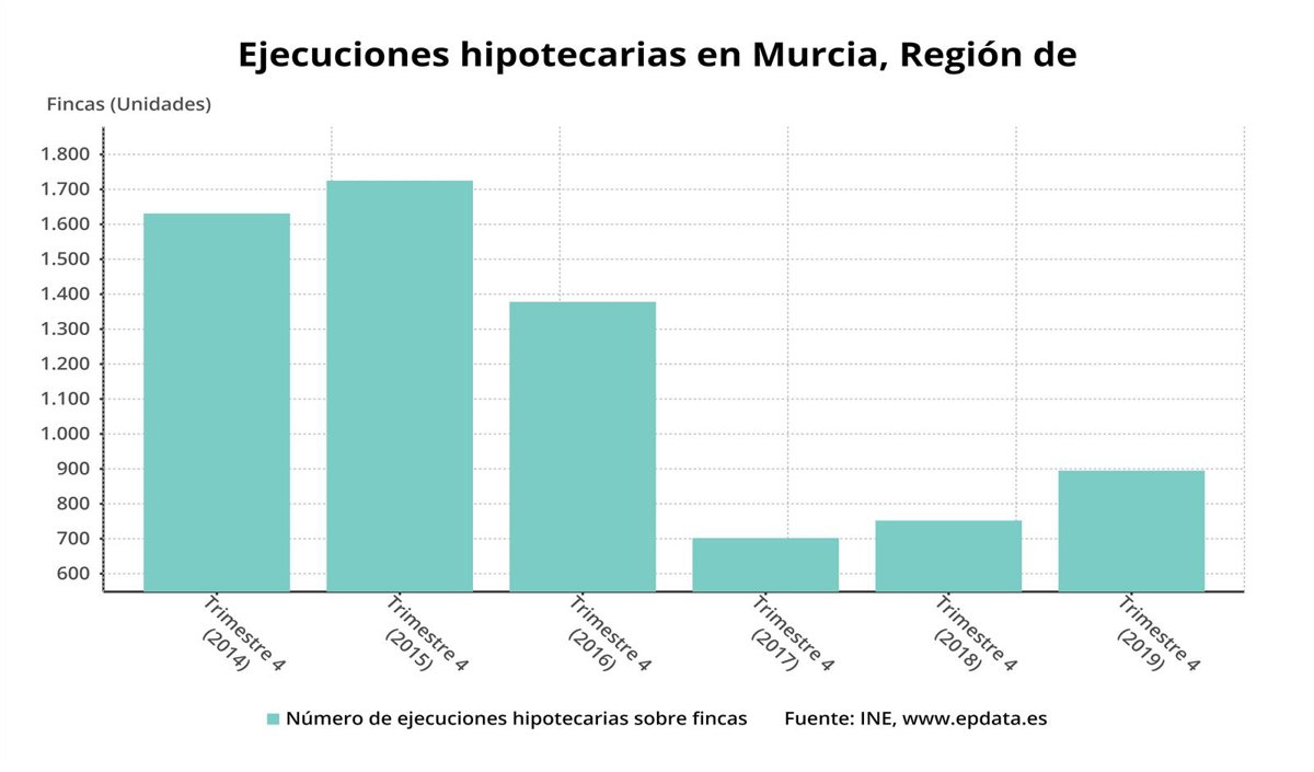 En el cuarto trimestre de 2019, Murcia registró 464 ejecuciones hipotecarias iniciadas sobre viviendas y 895 ejecuciones hipotecarias iniciadas, de las que 80 lo fueron sobre fincas rústicas y el resto sobre fincas urbanas, correspondiendo 464 a viviendas, 19 solares y 332 otras urbanas.