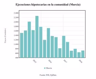 Por otro lado, la Región registró 723 ejecuciones hipotecarias iniciadas sobre el total de fincas, la sexta mayor cifra por comunidades.