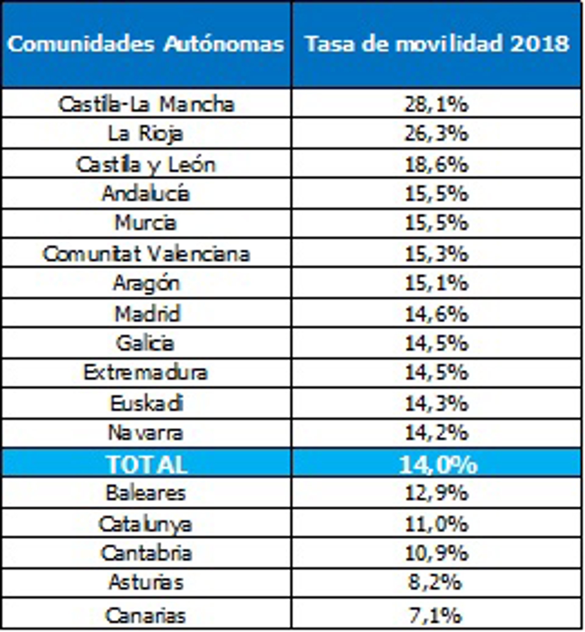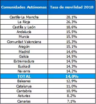 La comunidad autónoma ha sido una variable muy importante en este informe, ya que dependiendo de ello, la tasa puede oscilar entre el 28,1% y el 7,1%. Castilla-La Mancha y La Rioja son las regiones con mayor tasa de movilidad, ambas con índices superiores al 26 por ciento.