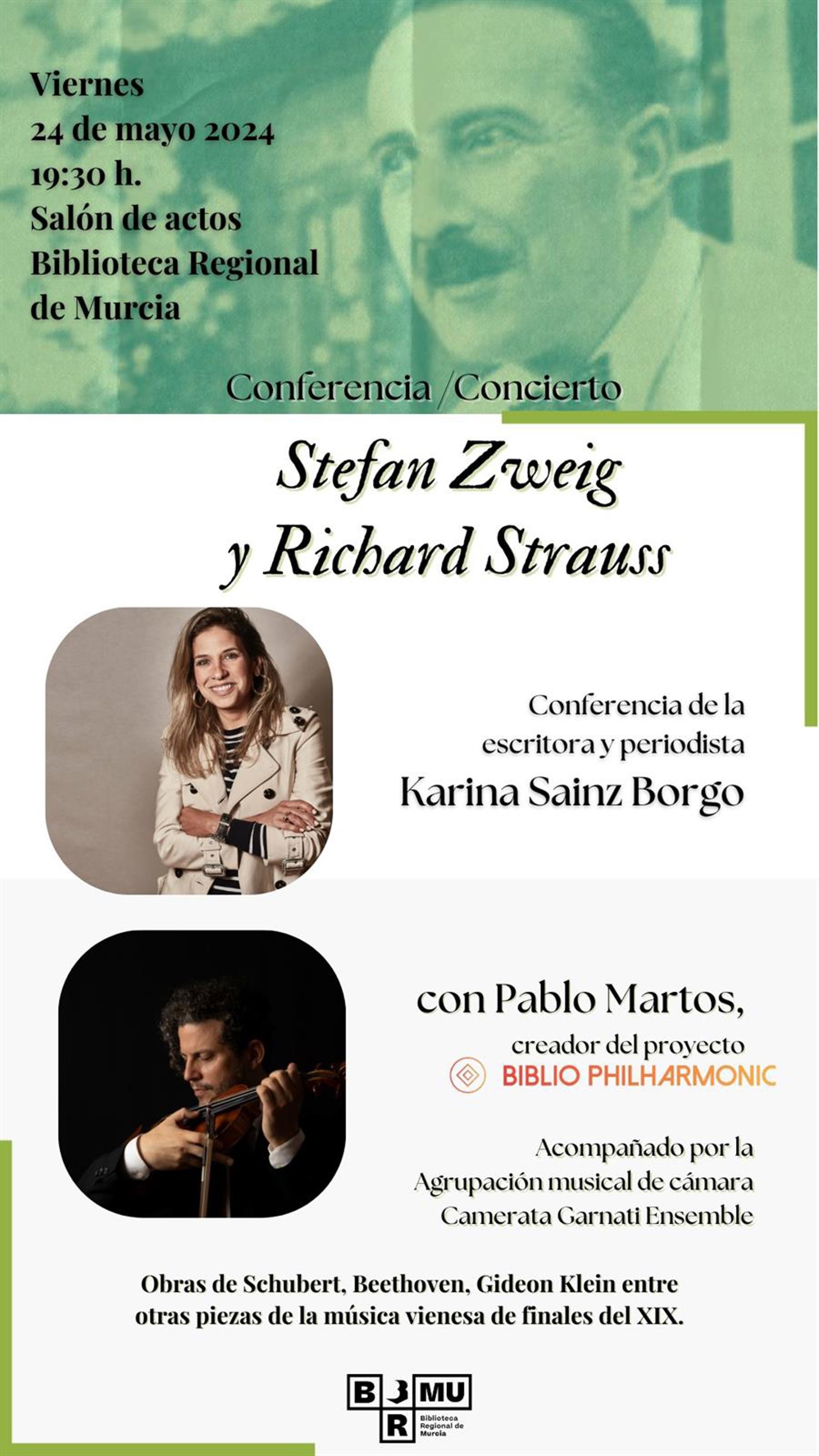 La Biblioteca Regional de Murcia (BRMU), dependiente de la Consejería de Turismo, Cultura, Juventud y Deportes, celebrará el próximo viernes, 24 de mayo, a las 19.30 horas, un acto que aúna música y literatura, enmarcado en el ciclo 'Biblioteca Regional, Biblioteca Universal', y con ocasión de la exposición sobre el autor austríaco Stefan Zweig, que se encuentra actualmente en el vestíbulo de la BRMU, en el que la Camerata Garnati Ensemble ofrecerá un breve concierto, conjuntamente con la conferencia de la escritora Karina Sainz Borgo.