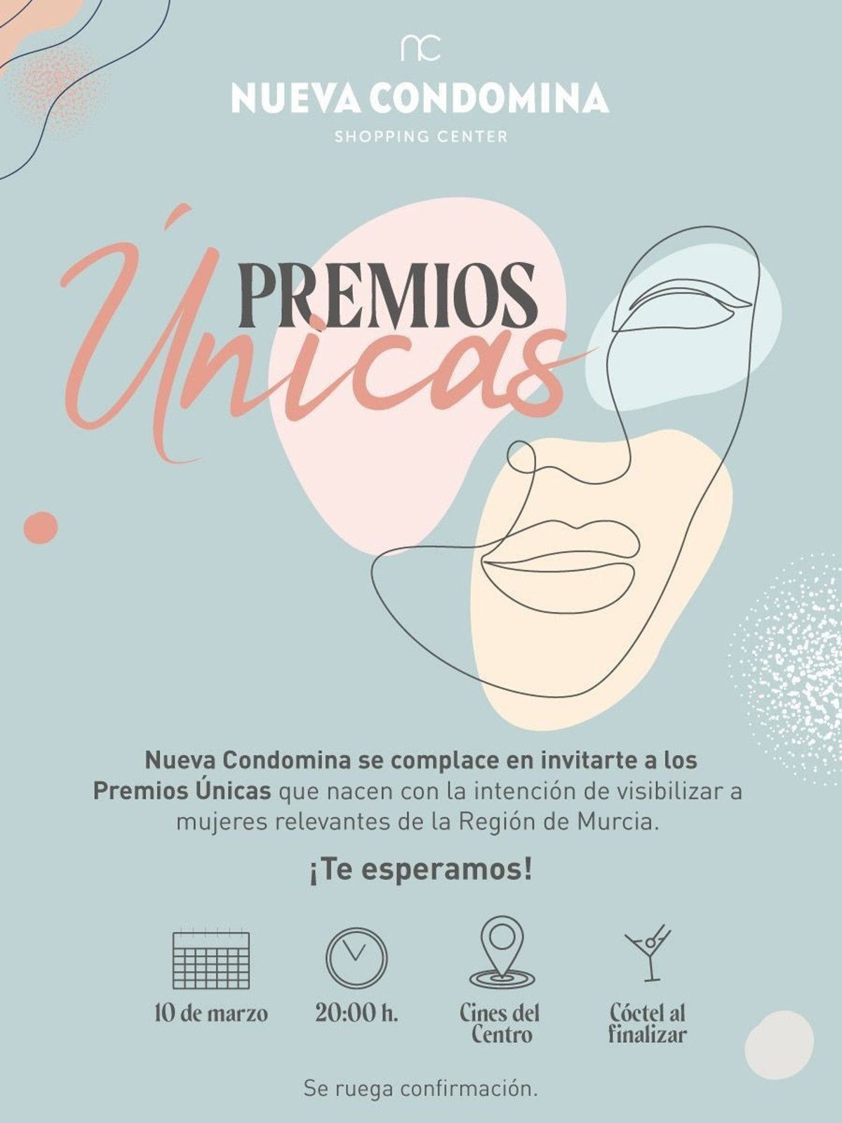 El Centro Comercial Nueva Condomina pone en marcha los premios 'Únicas' que valoran la trayectoria y el trabajo de mujeres relevantes de la Región de Murcia. El galardón nace con seis candidaturas y premios especiales, éstos se entregarán en una gala que se celebrará el próximo 10 de marzo en los cines Neocine de Nueva Condomina.