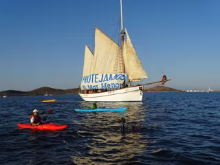 El nadador estuvo acompañado durante toda su travesía por tres piragüistas y por el velero Else, de la Asociación de Naturalistas del Sureste, que portaba la pancarta que hace 20 años sobrevolaba el Mar Menor en globo aerostático poniendo en marcha una de las campañas más largas y activas de la organización en defensa de la laguna.