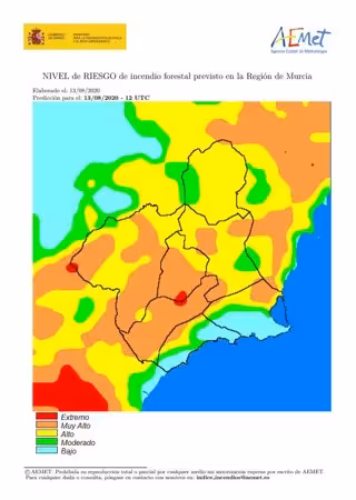 El nivel de riesgo de incendio forestal previsto para este jueves por la Agencia Estatal de Meteorología (Aemet) es muy alto en la Cuenca de Mula, el Valle del Guadalentín y el Noroeste.