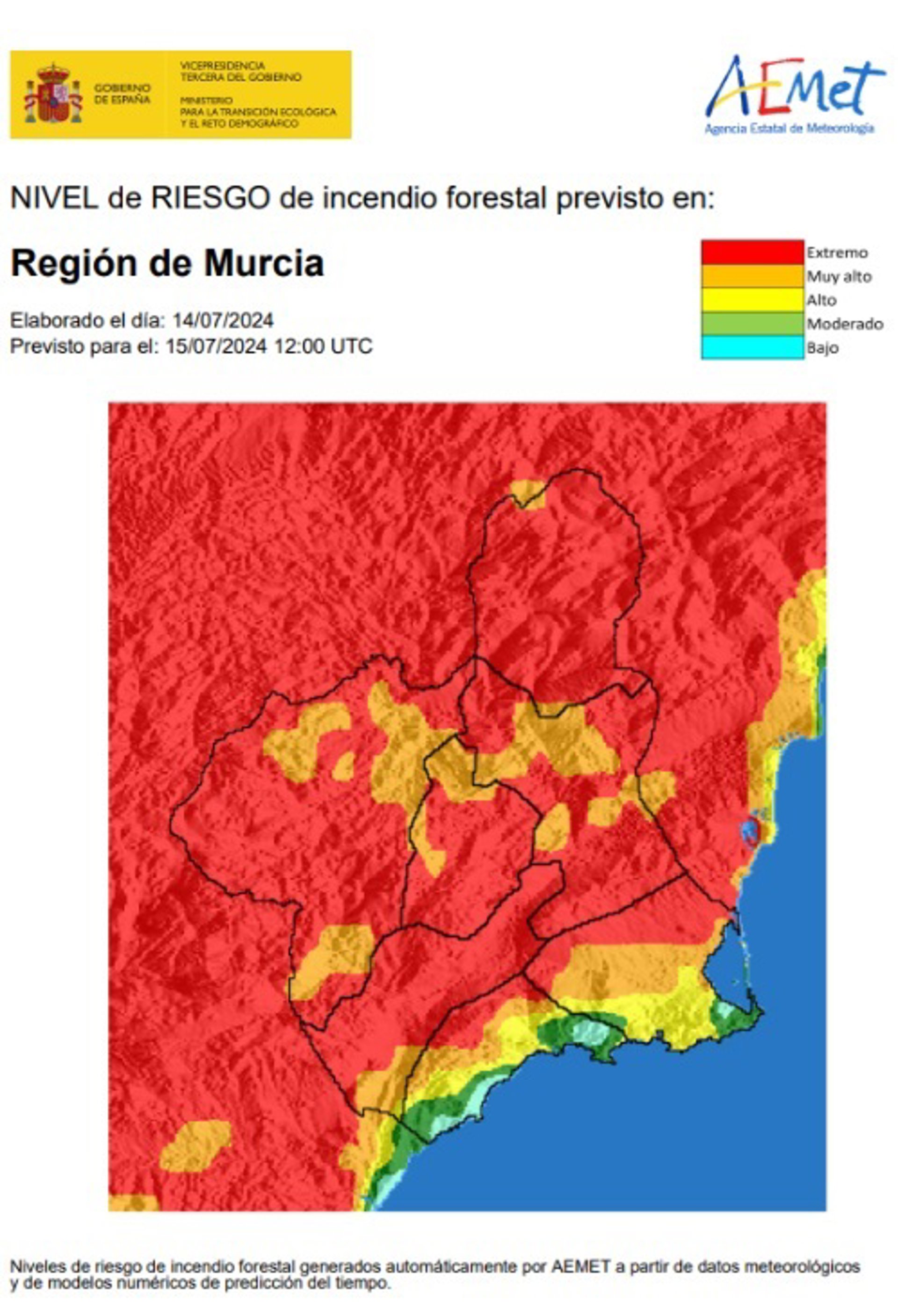 El nivel de riesgo de incendio forestal previsto por la Agencia Estatal de Meteorología para este lunes, 15 de julio, es extremo en casi toda la Región, según fuentes del Centro de Coordinación de Emergencias consultadas por Europa Press.