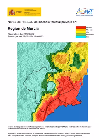 El nivel de riesgo de incendio forestal es extremo en el litoral y muy alto en el Valle del Guadalentín y la Vega Alta-Ricote-Murcia, según han informado fuentes de la Agencia Estatal de Meteorología (Aemet) consultadas por Europa Press.
