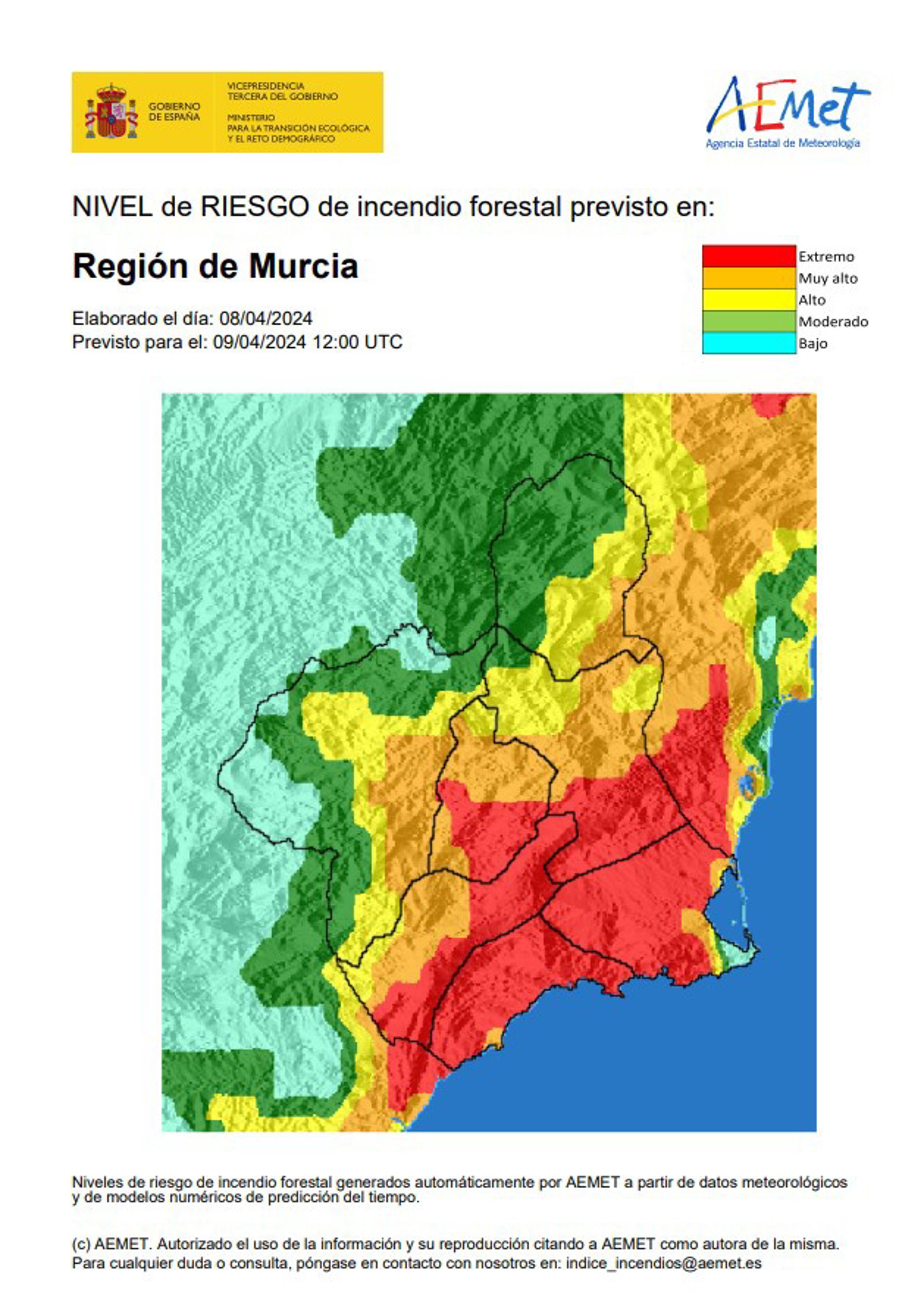 Nivel de riesgo de incendio forestal previsto en la Región de Murcia - AEMET