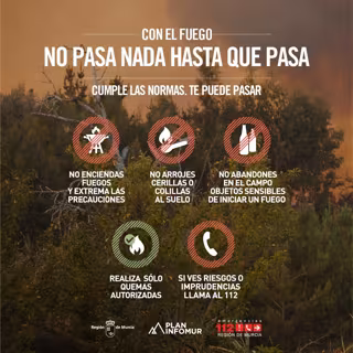 Por ello, la dirección del Plan Infomur, de lucha contra los incendios forestales en la Región de Murcia, recuerda no encender fuegos y extremar las precauciones, no arrojar cerillas o colillas al suelo, ni abandonar objetos sensibles de iniciar un fuego.