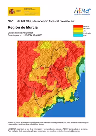 El nivel de riesgo de incendio forestal previsto por la Agencia Estatal de Meteorología para este jueves, 11 de julio, es extremo o muy alto en la mayor parte de la Región de Murcia, según fuentes del Centro de Coordinación de Emergencias consultadas por Europa Press.
