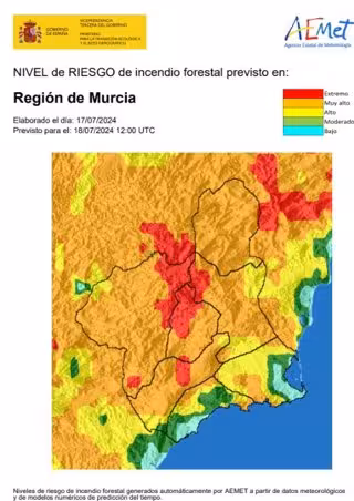 El nivel de riesgo de incendio forestal previsto por la Agencia Estatal de Meteorología para este jueves, 18 de julio, es muy alto en toda la Región, según fuentes del Centro de Coordinación de Emergencias consultadas por Europa Press.
