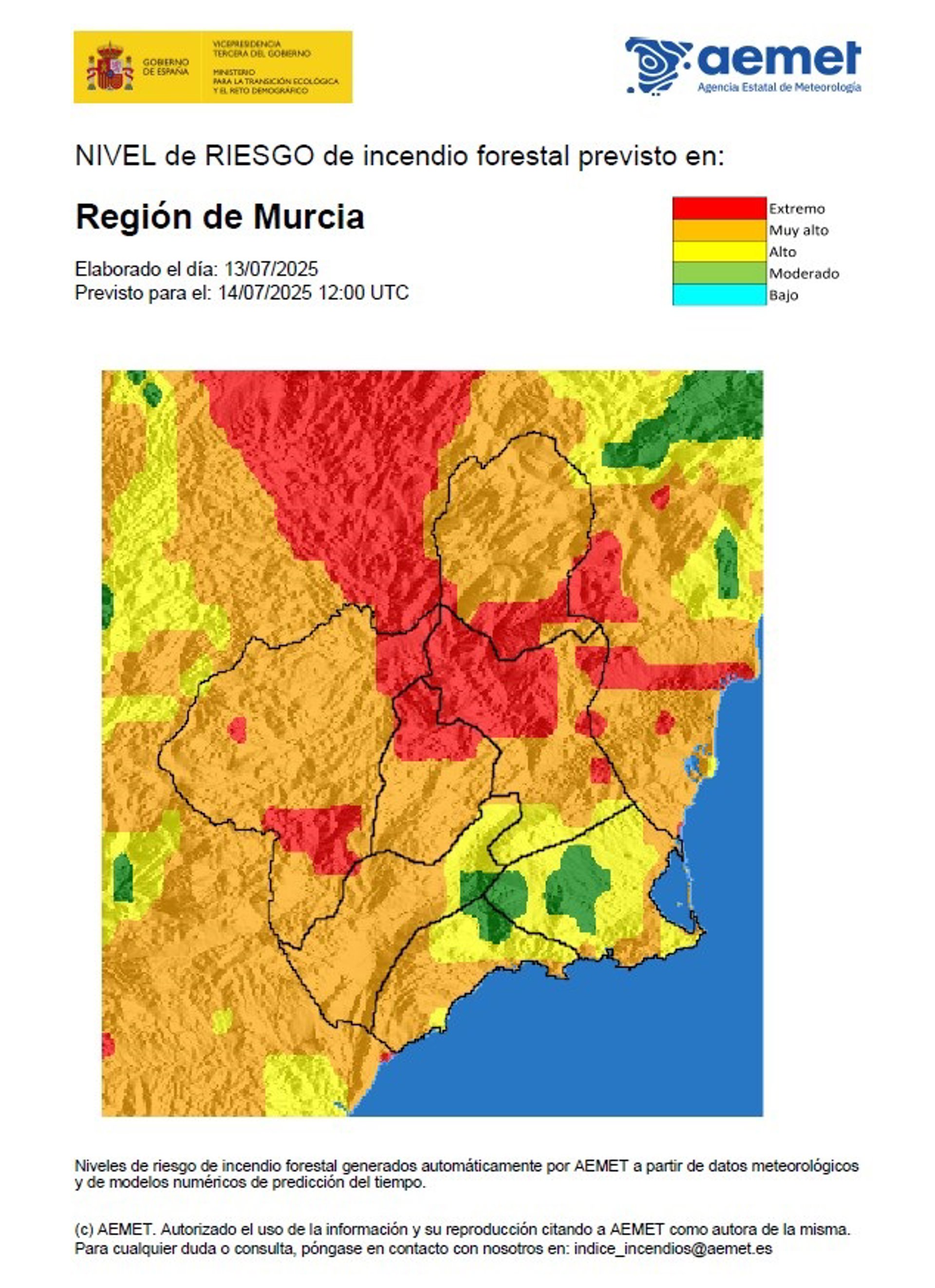 El nivel de riesgo de incendio forestal previsto por la Agencia Estatal de Meteorología (Aemet) para este lunes es muy alto en toda la Región de Murcia excepto en el litoral, donde es alto.