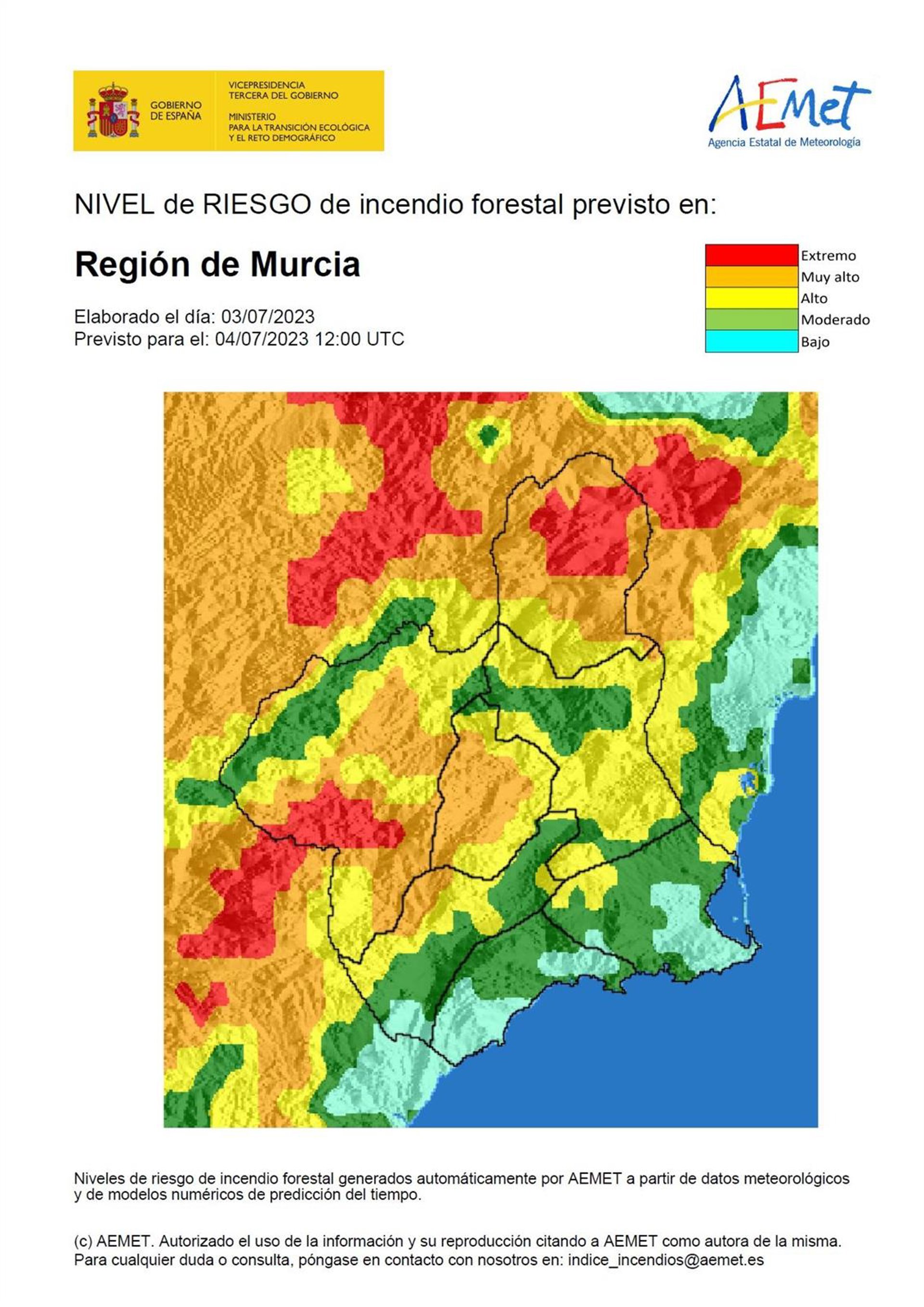 El nivel de riesgo de incendio forestal previsto por la Agencia Estatal de Meteorología (Aemet) para este martes, 4 de julio, es muy alto en el Altiplano y la Cuenca de Mula