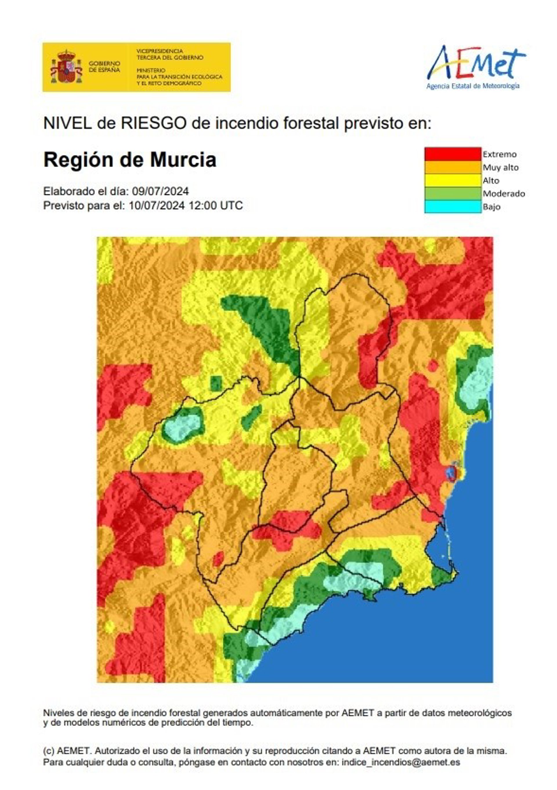El nivel de riesgo de incendio forestal previsto por la Agencia Estatal de Meteorología para este miércoles, 10 de julio, es muy alto en la mayor parte de la Región de Murcia, según fuentes del Centro de Coordinación de Emergencias consultadas por Europa Press.