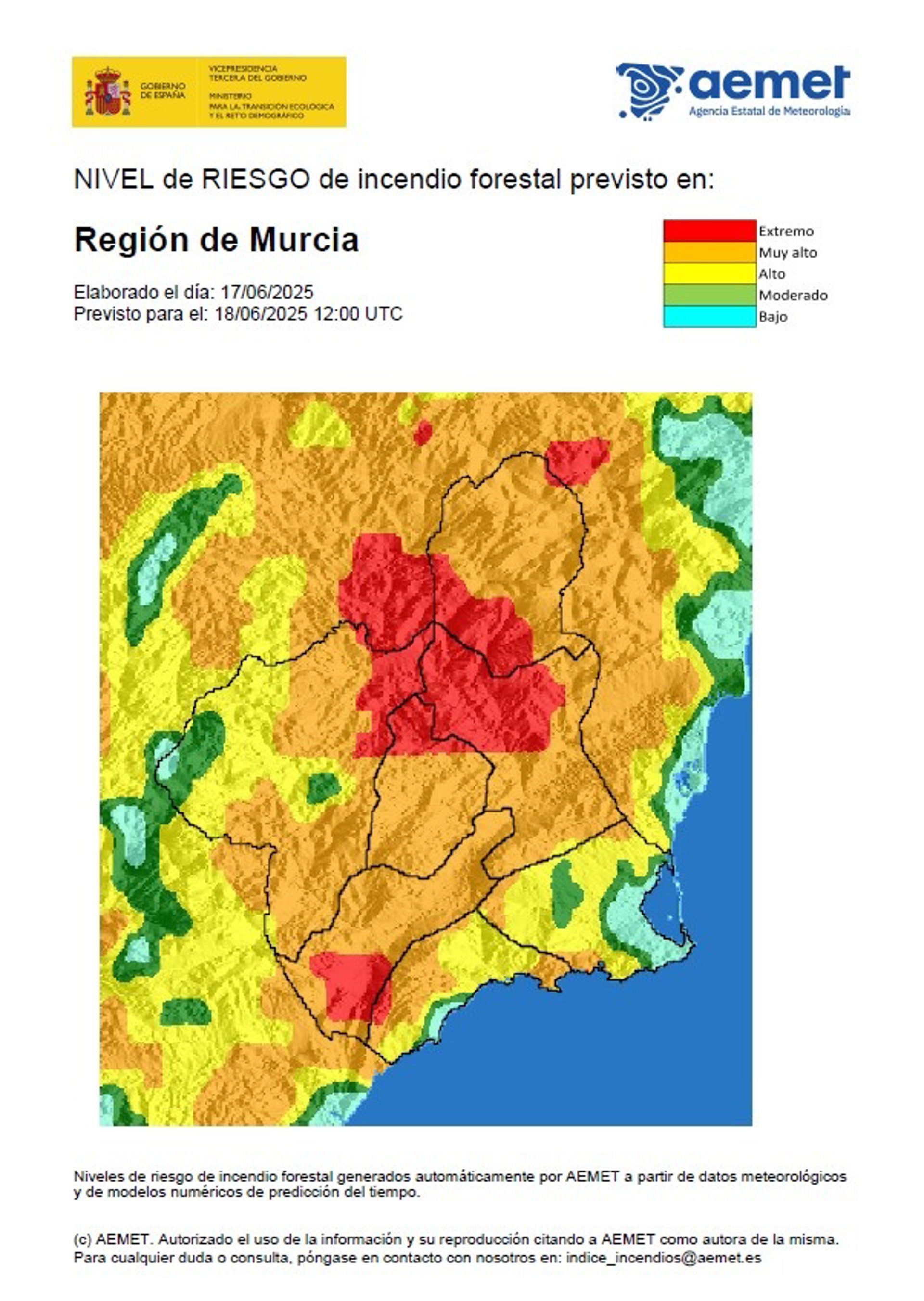 El nivel de riesgo de incendio forestal previsto por la Agencia Estatal de Meteorología (Aemet) para este miércoles es muy alto en el Noroeste, Altiplano, Cuenca de Mula, Guadalentín y Vega Alta-Ricote-Murcia y alto en el litoral este y oeste.