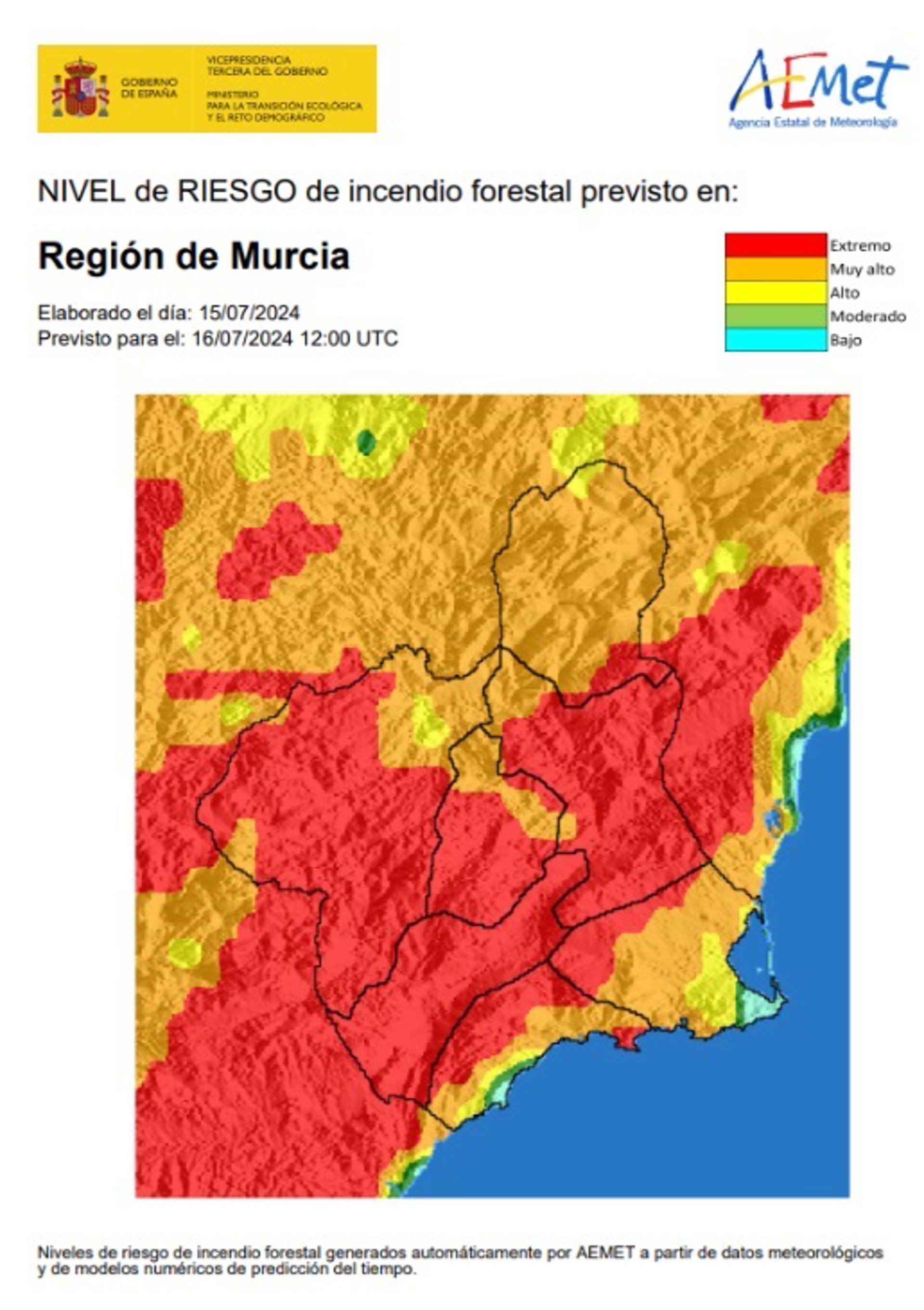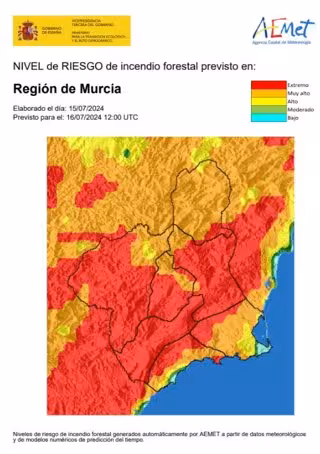 El nivel de riesgo de incendio forestal previsto por la Agencia Estatal de Meteorología para este martes, 16 de julio, es extremo o muy alto en toda la Región, según fuentes del Centro de Coordinación de Emergencias consultadas por Europa Press.