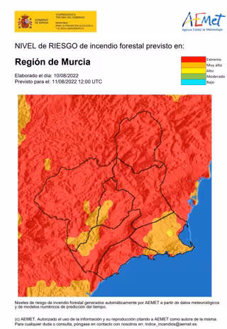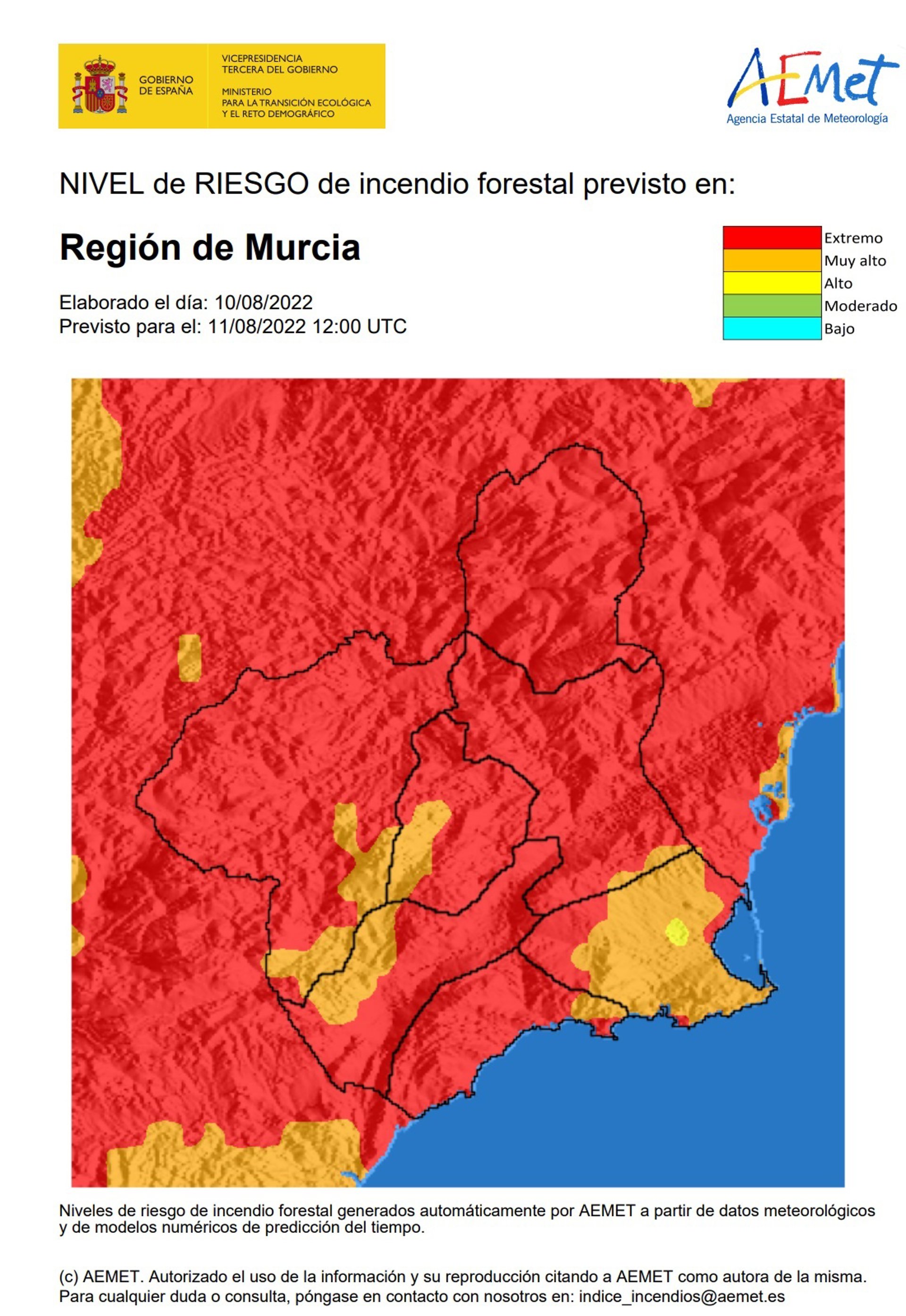 El nivel de riesgo de incendio forestal previsto para este jueves por la Agencia Estatal de Meteorología (Aemet) es extremo en toda la región menos en el litoral este, donde es muy alto.
