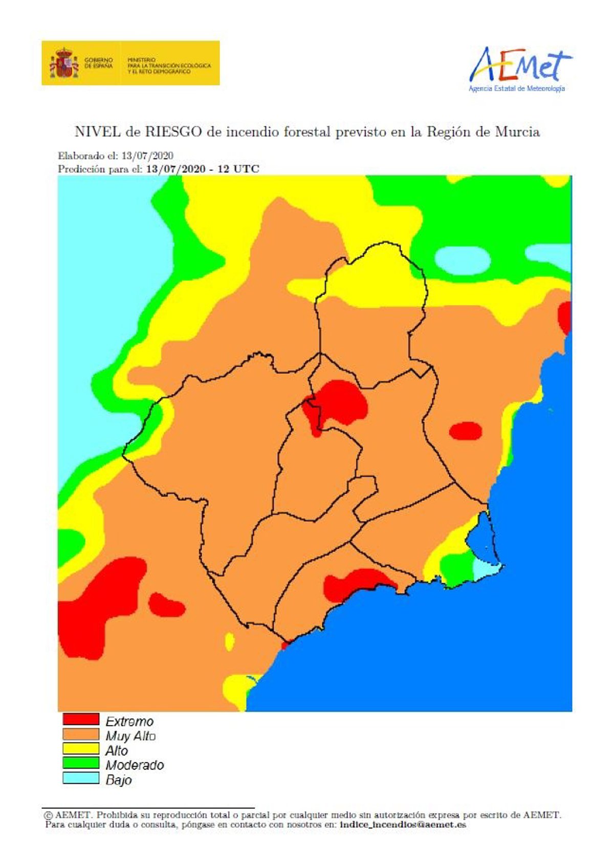 El nivel de riesgo de incendio forestal previsto por la Agencia Estatal de Meteorología (Aemet) para este lunes es "muy alto" en casi toda la Región de Murcia y sólo en el litoral este es alto, según fuentes del Centro de Coordinación de Emergencias consultadas por Europa Press.