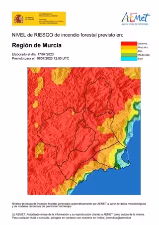 El nivel de riesgo de incendio forestal previsto por la Agencia Estatal de Meteorología (Aemet) para este martes es extremo en el Altiplano, la Cuenca de Mula, Guadalentín, Noroeste y Vega Alta-Ricote-Murcia.