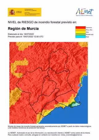 MURCIA, 19 Jul. (EUROPA PRESS) - El nivel de riesgo de incendio forestal previsto por la Agencia Estatal de Meteorología para este martes, 19 de julio, es extremo en toda la Región de Murcia, excepto en el litoral, donde es muy alto. La dirección del Plan Infomur, de lucha contra los incendios forestales en la Región de Murcia, recuerda la necesidad de evitar cualquier actividad que pueda provocar un incendio o ayudar a su propagación. Además, recuerda que, si se ve humo o fuego, "debe llamarse inmediatamente al 1-1-2", según fuentes del Centro de Coordinación de Emergencias consultadas por Europa Press.