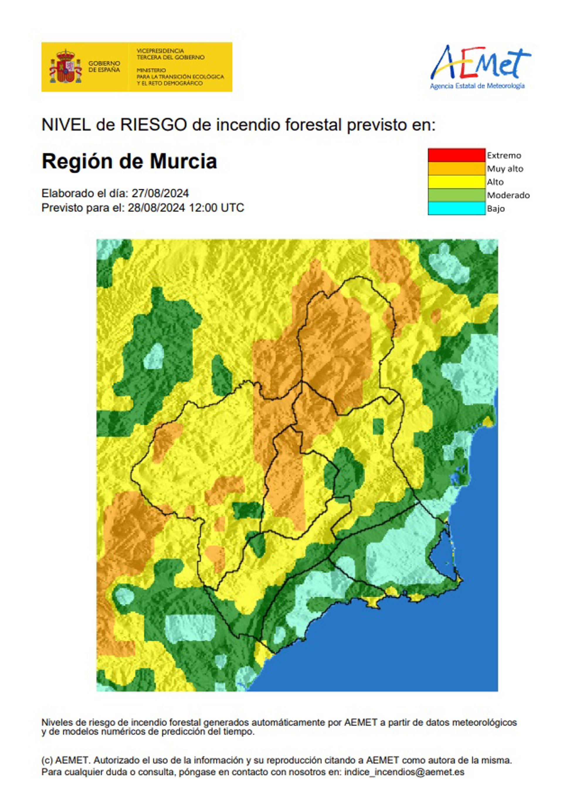 El nivel de riesgo de incendio forestal previsto por la Agencia Estatal de Meteorología (Aemet) para este miércoles, 28 de agosto, es muy alto en el Altiplano, según fuentes del Centro de Coordinación de Emergencias consultadas por Europa Press.