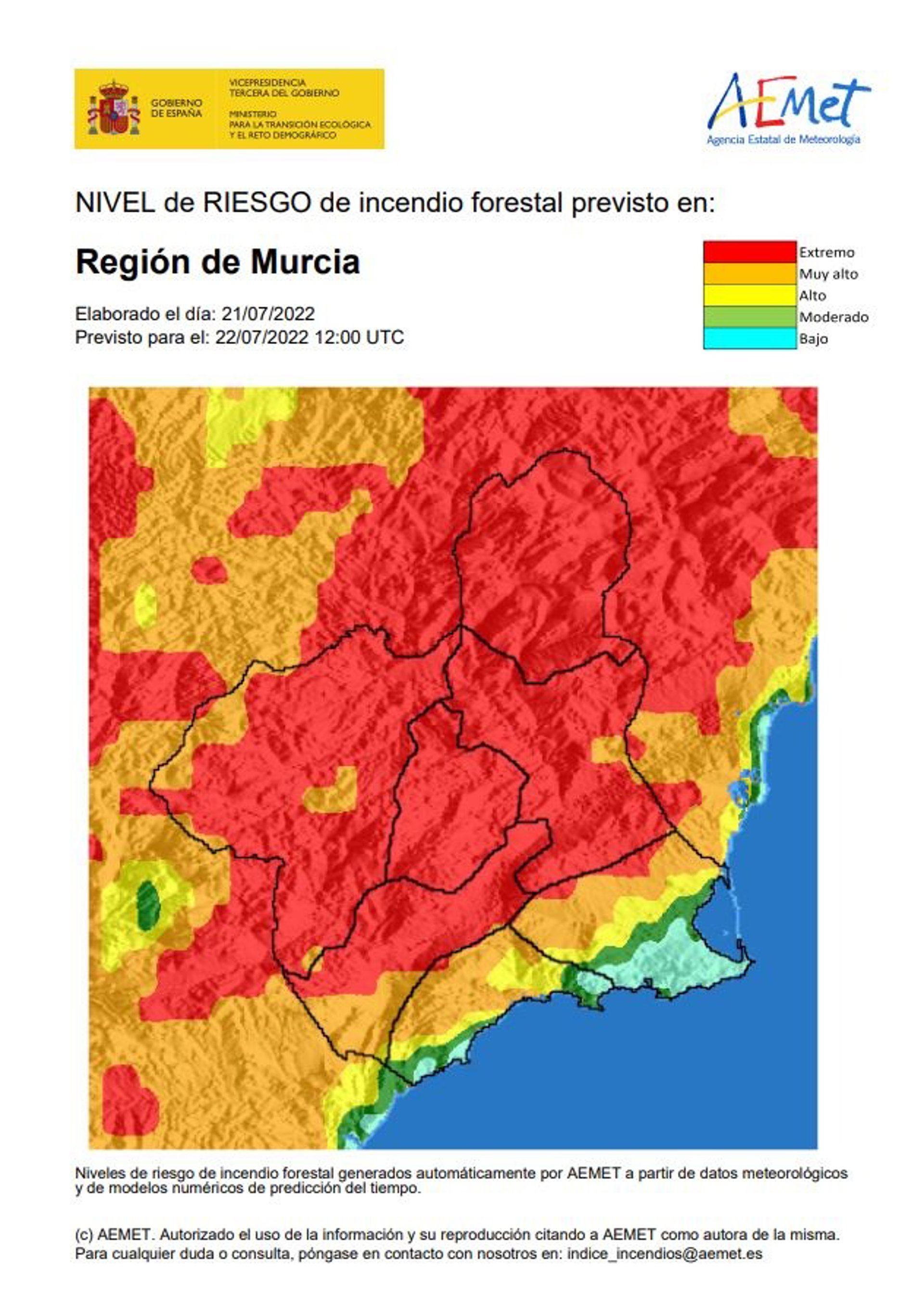 El nivel de riesgo de incendio forestal previsto para este sábado por la Agencia Estatal de Meteorología (AEMET) es extremo en casi la Región de Murcia, excepto en el litoral --que es moderado y alto-- y el Guadalentín --muy alto--.