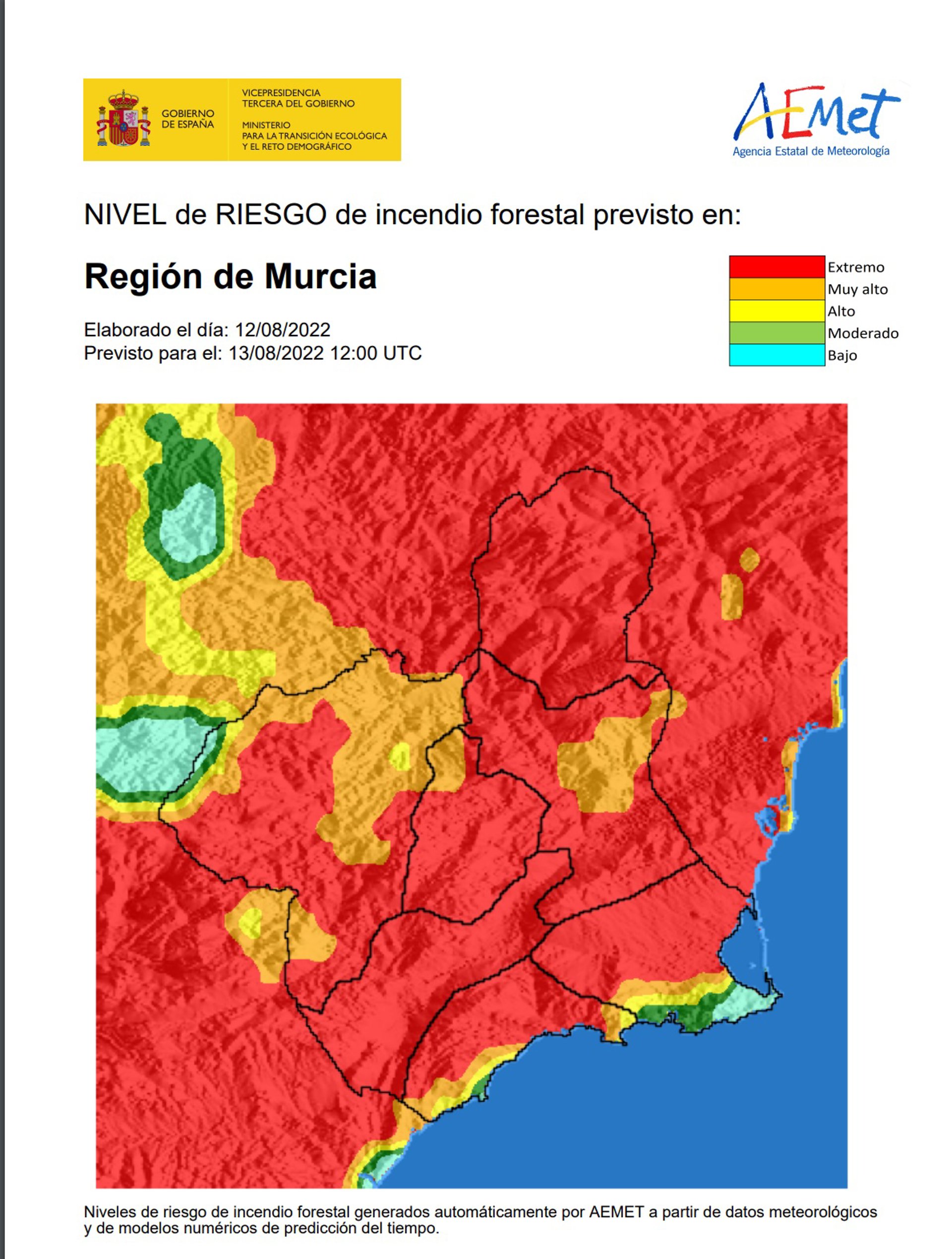 Nivel de incendio forestal previsto para la Región de Murcia a 13 de agosto de 2022 - AEMET