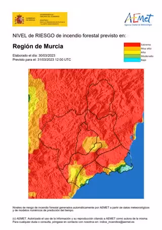 El nivel de riesgo de incendio forestal previsto para este viernes es extremo o muy alto en toda la Región de Murcia, según la Agencia Estatal de Meteorología (Aemet).