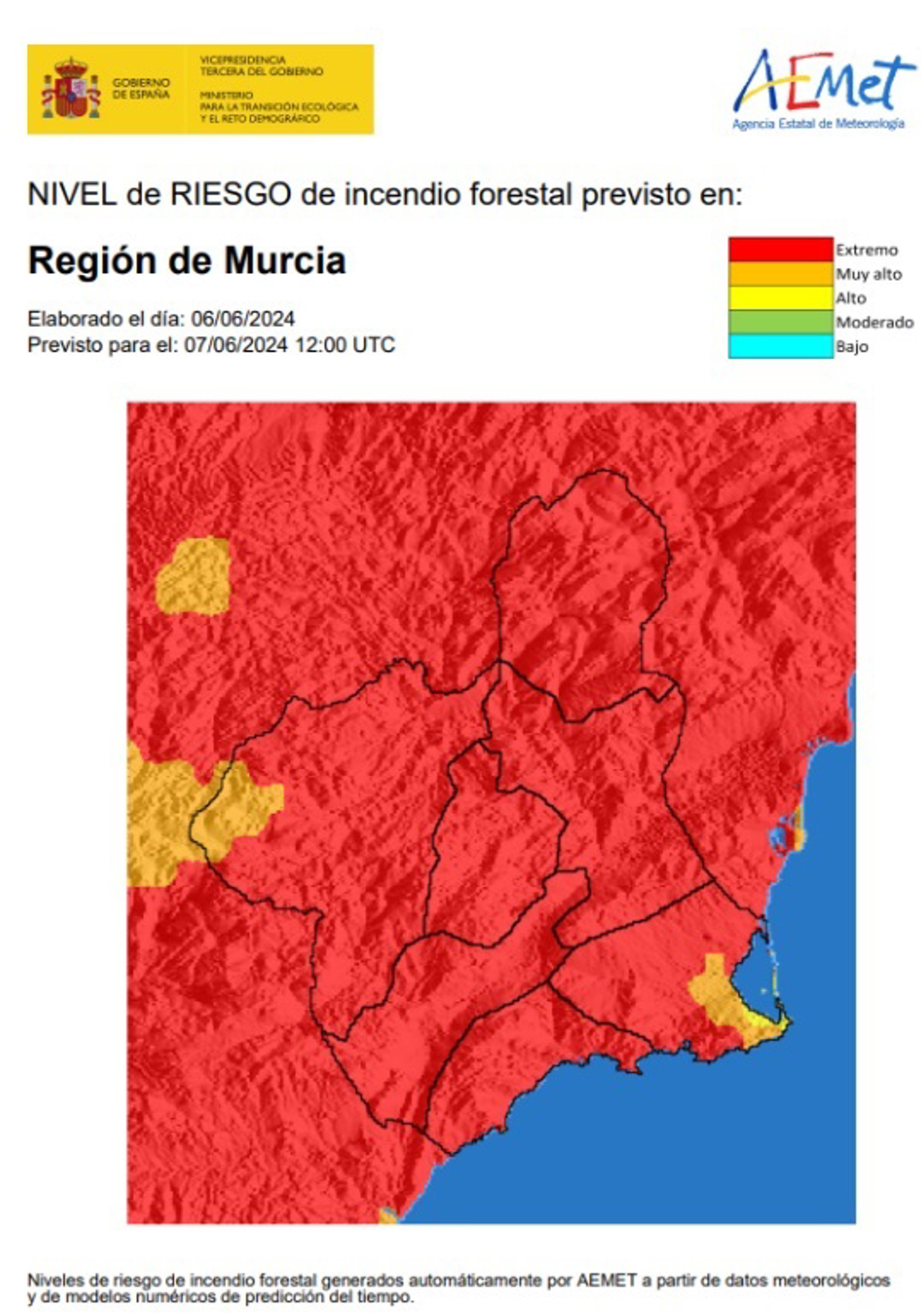 El nivel de riesgo de incendio forestal previsto por la Agencia Estatal de Meteorología (Aemet) para este viernes, 7 de junio, es extremo en toda la Región, según fuentes del Centro de Coordinación de Emergencias consultadas por Europa Press.