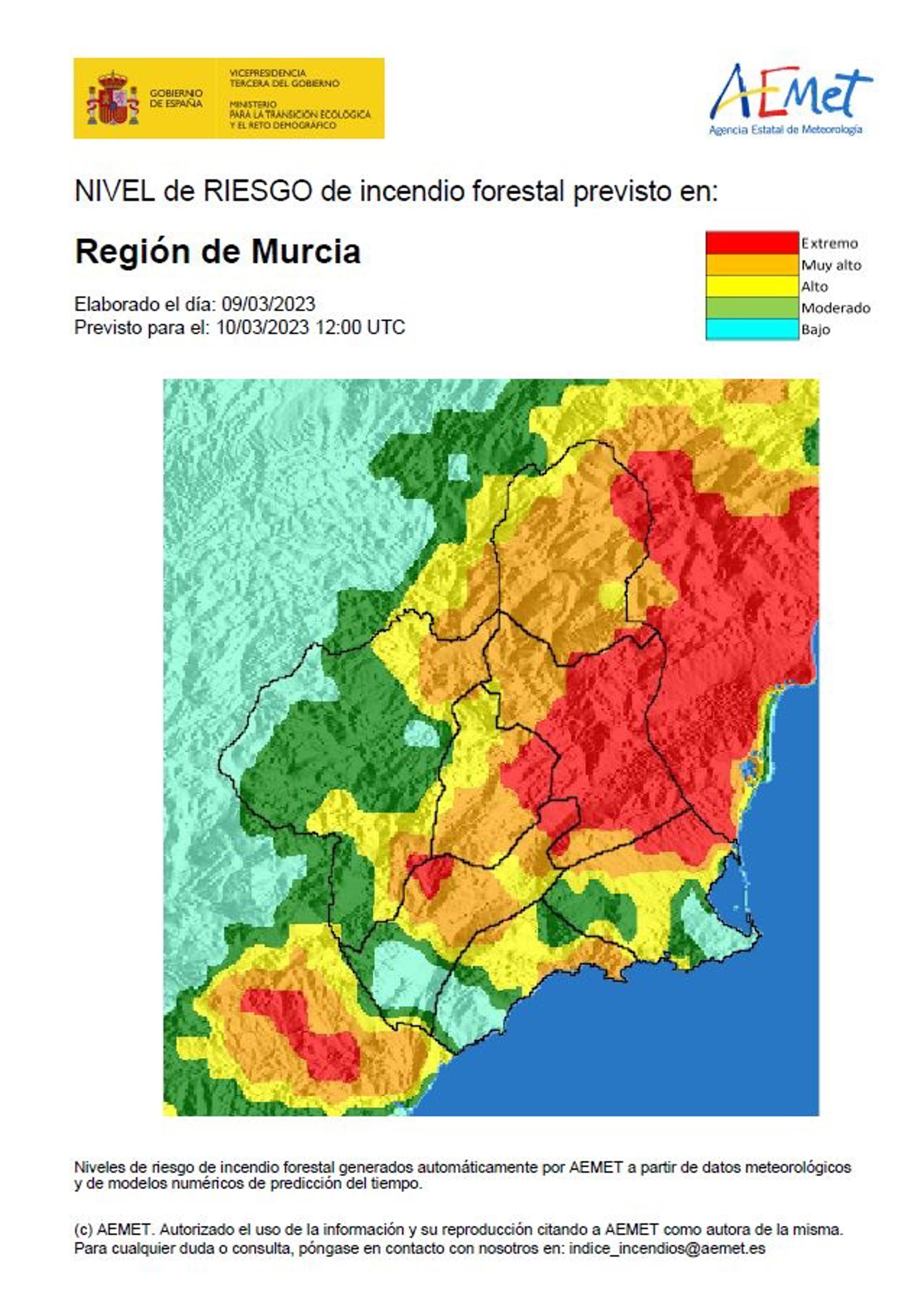 El nivel de riesgo de incendio forestal previsto para este viernes por la Agencia Estatal de Meteorología (Aemet) es extremo en la Vega Alta-Ricote-Murcia y muy alto en el Altiplano y la Cuenca de Mula.
