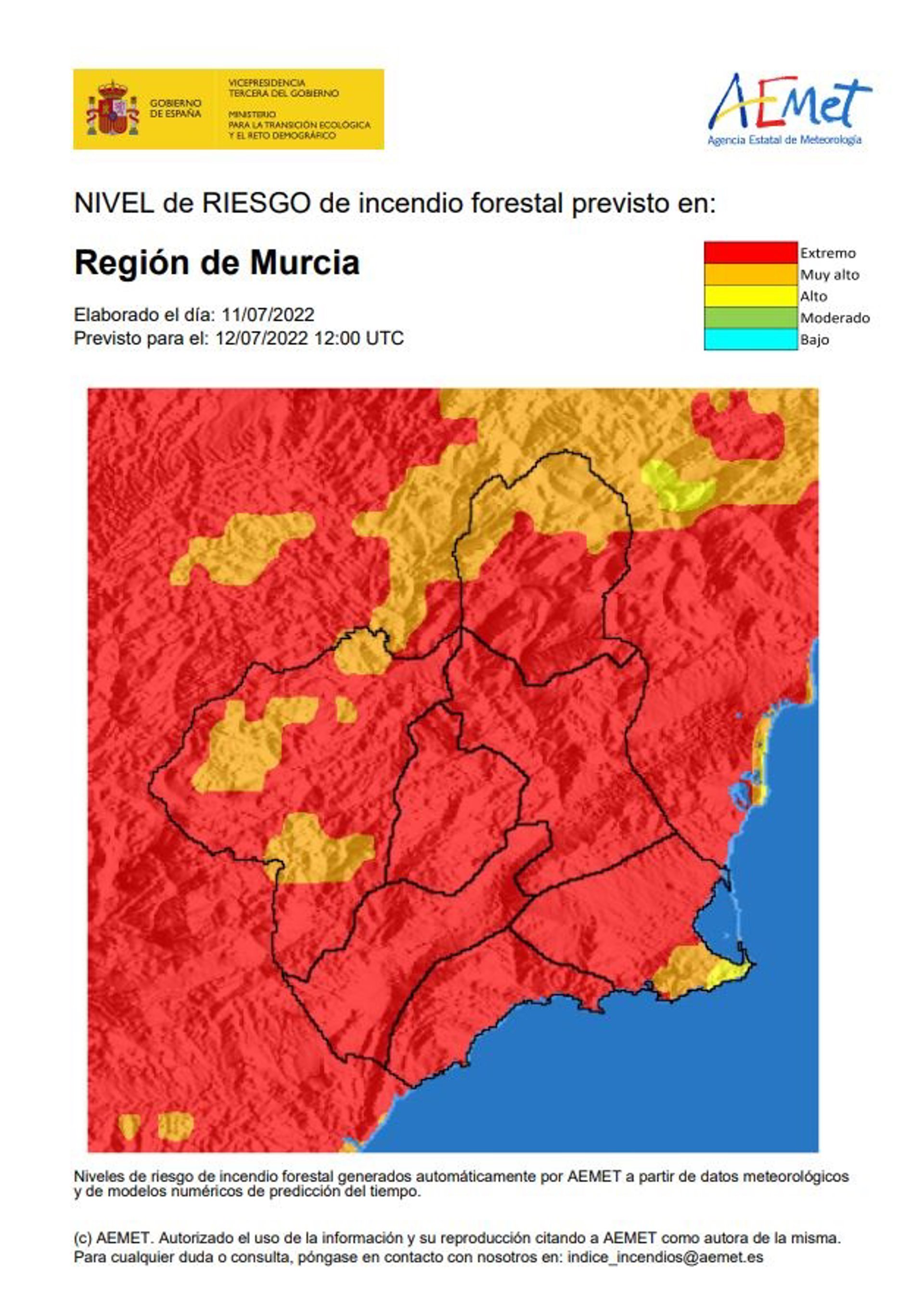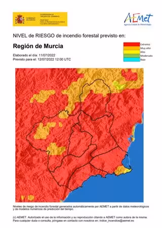 El nivel de riesgo de incendio forestal previsto por la Agencia Estatal de Meteorología (Aemet) para este martes sigue siendo extremo en toda la Región de Murcia, según fuentes del Centro de Coordinación de Emergencias consultadas por Europa Press.