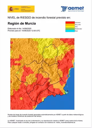 El nivel de riesgo medio de incendio forestal previsto para este viernes, 15 de agosto, es extremo en la mayor parte de la Región de Murcia, según la previsión de la Agencia Estatal de Meteorología (Aemet).
